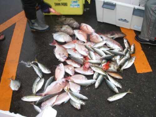 天気:小雨(凪)波おだやか 気温:朝5.0〜昼10.0度 水温:16.4〜17.0度(上り速く) 【釣果】 マアジ・25cm 20尾あまり チダイ・25〜35cm 20尾ぐらい マダイ・35cm 1尾 マハタ・35cm 1尾 マトウダイ・35〜45cm 5尾 カイワリ・25cm 3尾 ガシラ・20cm 2尾 小ア…